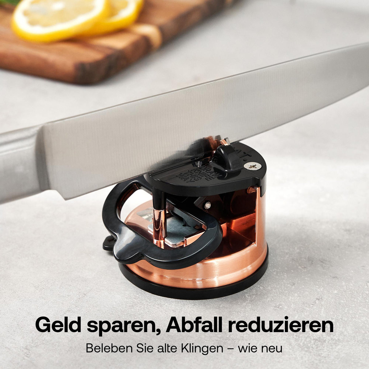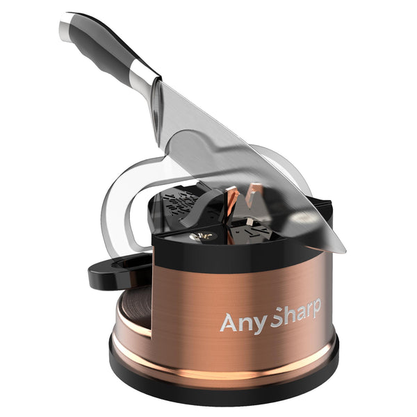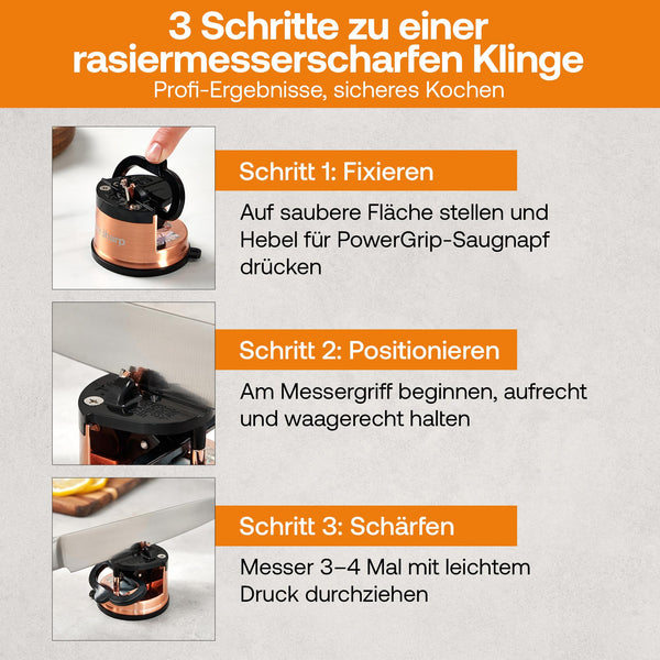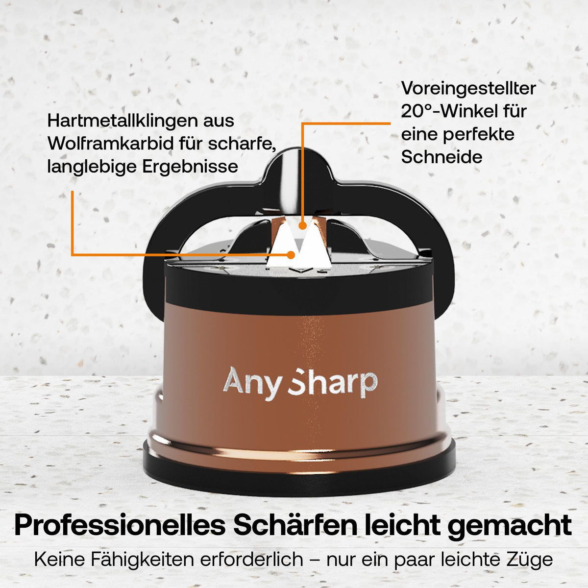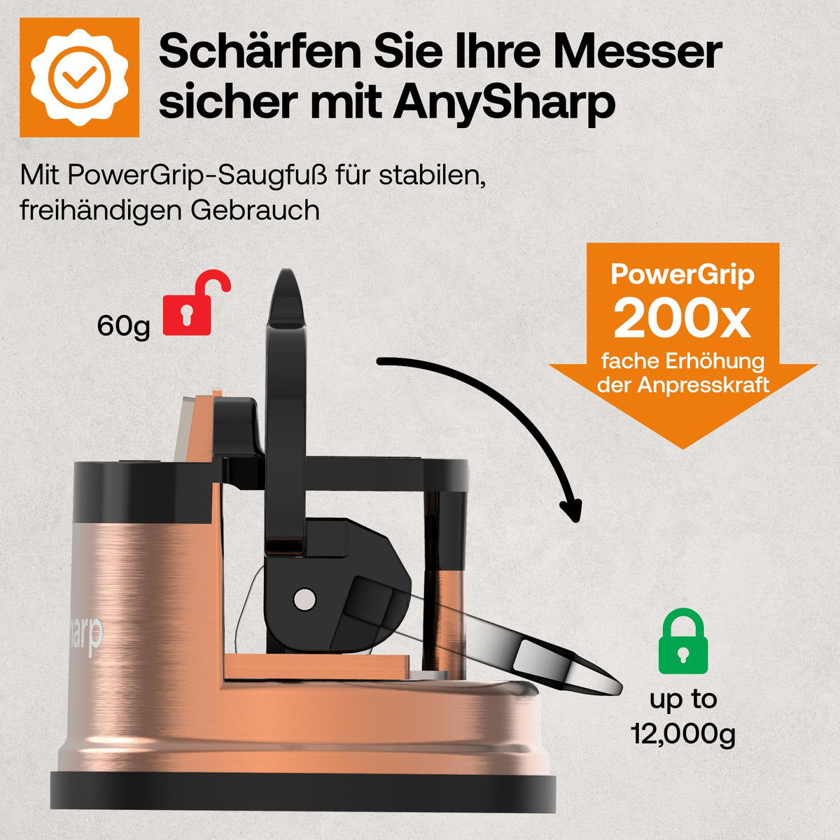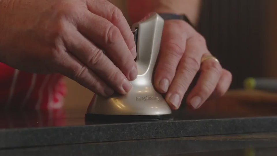 AnySharp-Schärfer verfügen über eine PowerGrip-Saugfußbasis, die sie sicher auf jeder glatten Oberfläche fixiert. Dieses freihändige Design macht das Schärfen sicherer, einfacher und stabiler – perfekt für jede Küche.